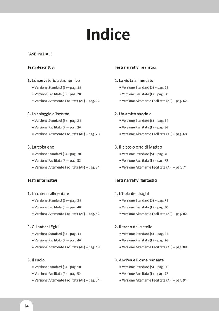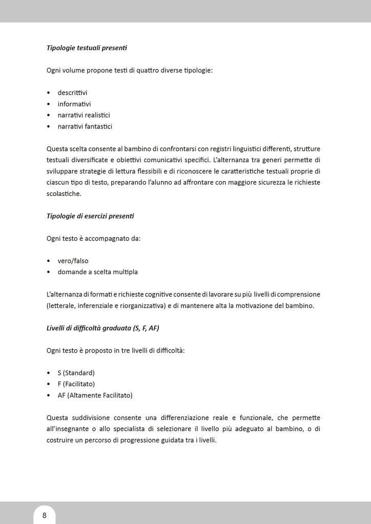 I testi, di tipologia descrittiva, informativa, narrativa realistica e fantastica, sono proposti in tre livelli di difficoltà: Standard (S), Facilitato (F) e Altamente Facilitato (AF) e in due fasi dell’anno scolastico (iniziale e finale). Questa organizzazione permette di adattare con precisione il percorso alle esigenze di ogni bambino, seguendo la naturale progressione delle competenze.