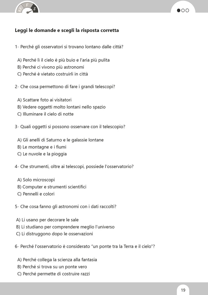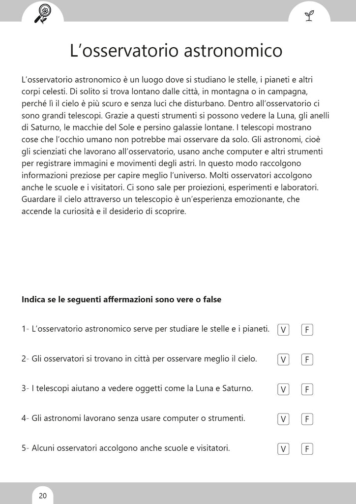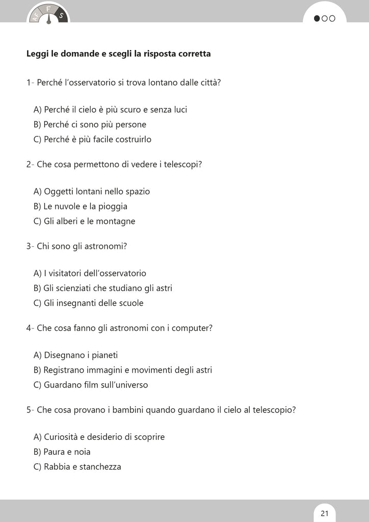 Gli esercizi collegati ai testi comprendono domande aperte, vero/falso, scelte multiple, riordino di frasi e cloze. Questa varietà permette di lavorare su diversi livelli di comprensione (letterale, inferenziale e riorganizzativa), stimolando strategie di lettura attiva e mantenendo alta la motivazione.