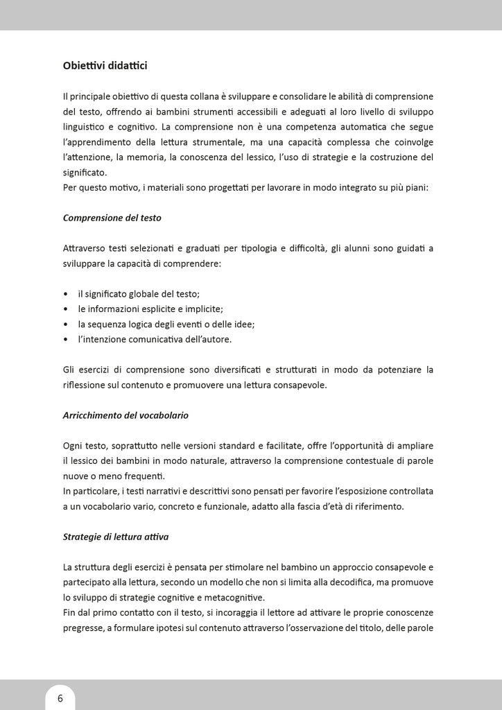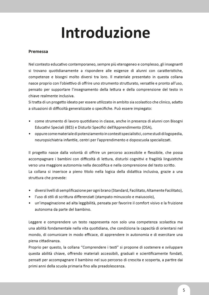 Questo volume è parte di un progetto editoriale che offre strumenti strutturati e flessibili, utilizzabili sia a scuola sia in contesti clinici ed educativi, con l’obiettivo di allenare e potenziare le abilità di lettura e comprensione in chiave inclusiva.